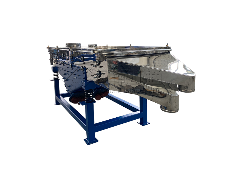 直线振动筛(直线筛)利用振动电机激振作为振动源,使物料在筛网上被抛起,同时向前作直线运动,物料从给料机均匀地进入筛分机的进料口,通过多层筛网产生数种规格的筛上物、筛下物,分别从各自的出口排出。具有耗能低、产量高、结构简单、易维修、全封闭结构,无粉尘溢散,自动排料,更适合于流水线作业。